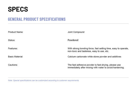 Смесь штукатурной плиты совместная влажный материал который использован для установки гипсокартона для того чтобы придерживаться бумажная совместная лента, соединения заполнения, и покрываться бумага и цепляться совместные ленты, так же, как для шариков пластмассы и металла угловых. Ее можно также использовать для того чтобы отремонтировать отверстия и отказы в гипсокартоне и гипсолите.